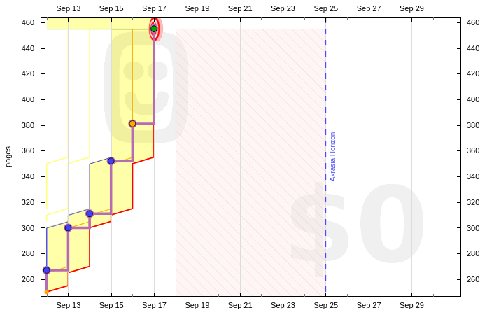 So I set up an odometer graph requiring just 5 pages per day, set up an autoratchet so it can’t accumulate safety buffer… and so far each of those books has been finished within a week of creating the graph, even though I only needed to read five pages a day.