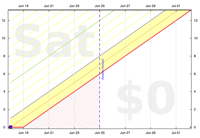 Do you see the problem with how we did it? We defined the yellow brick road — the path from where you are today to your goal — in terms of the centerline but then allowed a fudge factor known as “the wrong lane”. In the so-called wrong lane, you’d be off from the goal you set for yourself but within a window that Beeminder still considered “on the road”. Besides violating a fundamental tenet of Beeminder it yielded a cascade of bugs and confusion and flat-out wrongness. Like how if you dialed in a goal to do X things by time T, Beeminder enforced something slightly but infuriatingly different.