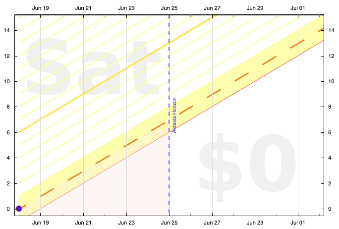 For the colors based on days of safety buffer and the colors based on location on the graph to match, the width of the road was computed such that you’d go from the good side (green) to the good lane (blue) to the wrong lane (orange) to the wrong side (red) each a day apart. The width had to be wider when the road was steeper and narrower when the road was shallower. Technically, if the road was flat then it should’ve had no thickness at all. But that was a big problem if you scheduled a flat spot on your road for a vacation. It would mean that you could be skating the edge of your road, in the wrong lane, and then when your flat spot mercifully arrived, the road would shrink out from under you and you’d have to do an extra day’s work to get back onto it. That was obviously no good so we made a special case: the width of the road on a flat spot was the max of the widths on either side of the flat spot. Fine. Except if you happened to schedule not a fully flat spot but just an almost flat spot, you’d be bitten in the butt by the shrinking road problem after all and it would all be a big bubbling pot of magic putrescence. (Maybe I’m overstating it now; we’re just so relieved to have finally peeled off the layers of duct tape and solved the root of these problems.)