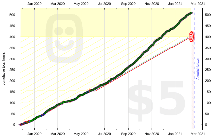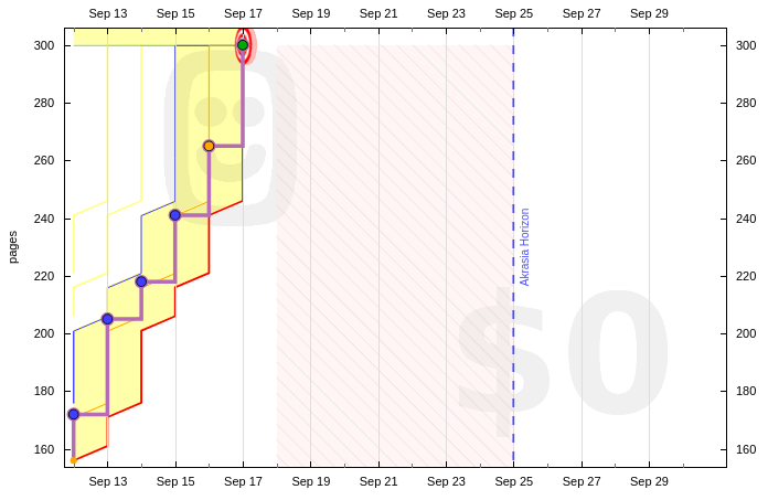 So I set up an odometer graph requiring just 5 pages per day, set up an autoratchet so it can’t accumulate safety buffer… and so far each of those books has been finished within a week of creating the graph, even though I only needed to read five pages a day.