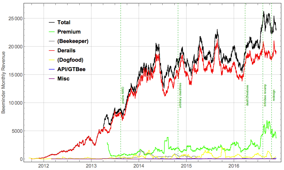 Note the nice jump in revenue which means our 2016 commitment device has paid off and Beeminder will flourish into 2017 and beeyond:
